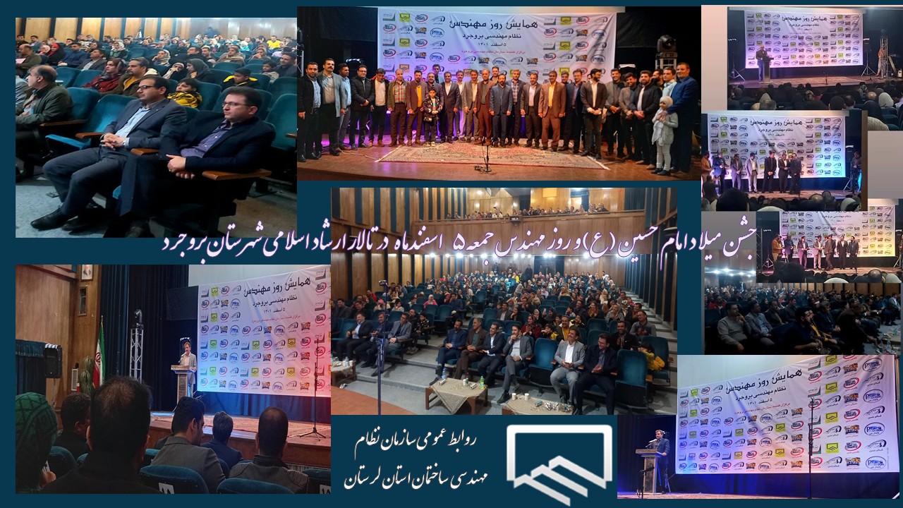 جمعه پنجم اسفند ماه سال جاری جشن ویژه میلاد امام حسین (ع) و روز مهندس با حضور اعضای سازمان نظام مهندسی ساختمان ، مهندس حمزه حیات پور رئیس سازمان نظام مهندسی ، هیات مدیره سازمان، دکتر یاسر امیر سرداری معاونت عمرانی فرمانداری بروجرد و مهمانانی در سالن ارشاد اسلامی شهرستان بروجرد برگزار شد که با استقبال پرشور جامعه مهندسی این شهرستان همراه بود.